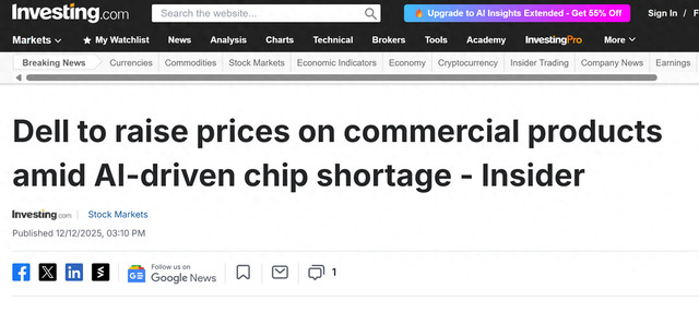 据了解,此次涨价的核心原因是全球内存芯片(DRAM)与存储芯片(NAND)供应短缺,这两类芯片是绝大多数电子设备的核心组件,其供应紧张直接推高了PC行业整体生产成本。不仅戴尔,联想、惠普等行业竞争者均受到这一行业性问题的影响。同时,AI基础设施建设需求激增,各大科技企业纷纷加大对内存与存储芯片的采购力度,进一步加剧了消费类设备领域的芯片资源竞争,间接推动了产品价格调整。