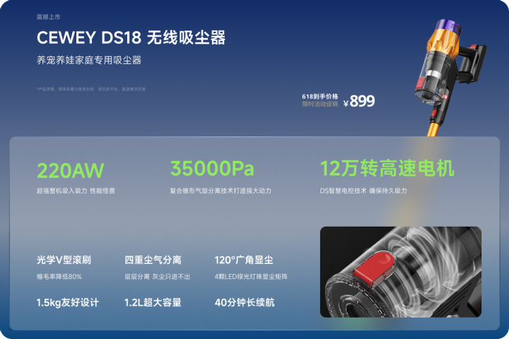 吸力性能优越:内部搭载12万转高速无刷电机,最大输出功率可达220AW,真空度35kPa,吸力强劲且稳定。CEWEY自主研发的复合锥形气旋分离系统能让尘气分离率达到99%,长时间清洁后仍能保持吸力不衰减。相比普通单锥设计,它的除尘效率更高,适合处理宠物毛发、地毯灰尘等高密度污物。