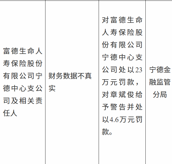 4月13日,宁德金融监管分局行政处罚信息公示表显示,富德生命人寿保险股份有限公司宁德中心支公司因财务数据不真实被处以23万元罚款,责任人章某俊被给予警告并处以4.6万元罚款。